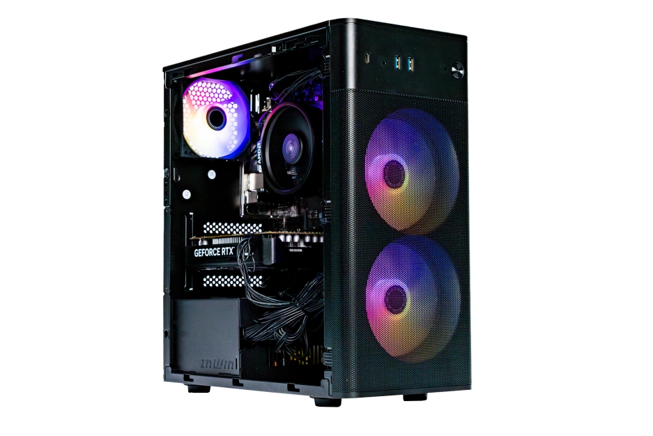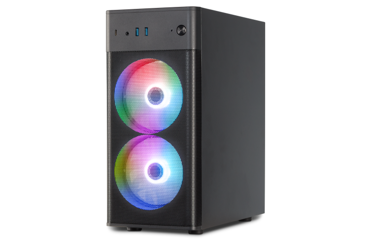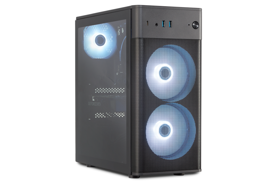 Om te zorgen dat alles stabiel draait, is de ERAZER Recon P45 voorzien van ruim voldoende koeling: een krachtige koeler op de processor, en drie grote ventilatoren die lucht langs alle onderdelen laten stromen. Die zijn bovendien voorzien van fraaie, kleurrijke RGB-verlichting. Een krachtige 550 watt voeding zorgt voor stevige stroomvoorziening. Dit alles is gevat in een strak vormgegeven, lekker compacte torenbehuizing, met aan een kant een gehard glazen venster. Daardoor kan je het fraai uitgelichte binnenwerk van je gaming PC mooi zien. Aan de voorkant zitten bovenin makkelijk toegankelijke aansluitingen voor USB-A, USB-C en een hoofdtelefoon.