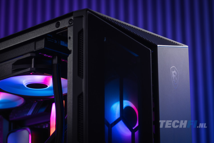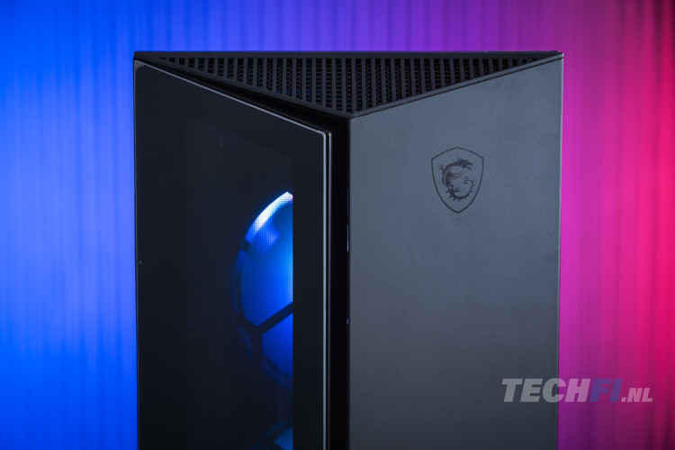 Vanzelfsprekend hijst MSI al die interessante hardware ook weer in een net iets mooier jasje. De Enge Game PC neemt plaats in de MPG Gungnir 110R-behuizing: een nette atx mid-tower van MSI, met nu voorop een extra plaatje tempered glass. Qua ruimte en uitbreidbaarheid verschilt de kast niet enorm van de MAG Forge M100R, al is hij als atx-kast wel gewoon wat groter. Het verschil zit ‘m hoofdzakelijk in een paar stukjes extra luxe.
