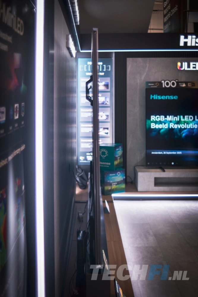 Hoewel miniled geen per-pixel dimming kan bieden, komt de Hisense 116UX met rgb miniled wel met ongekend veel dimming zones. Welgeteld 20.000. Het zorgt wel voor een wat dikker profiel, zeker op dit formaat. Daar is enige dikte ook nodig voor structurele stevigheid. Hisense omarmt die verandering echter wel op slimme wijze, met een nuttige opvulling van het chassis.