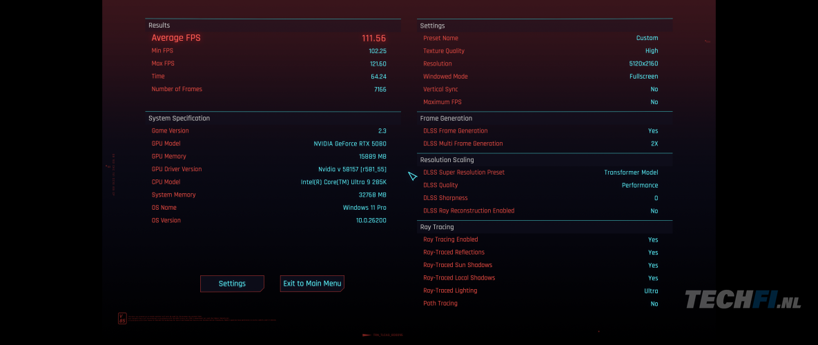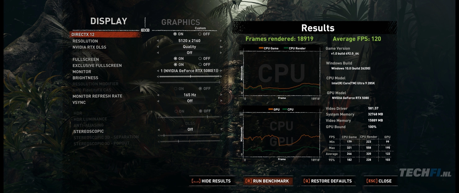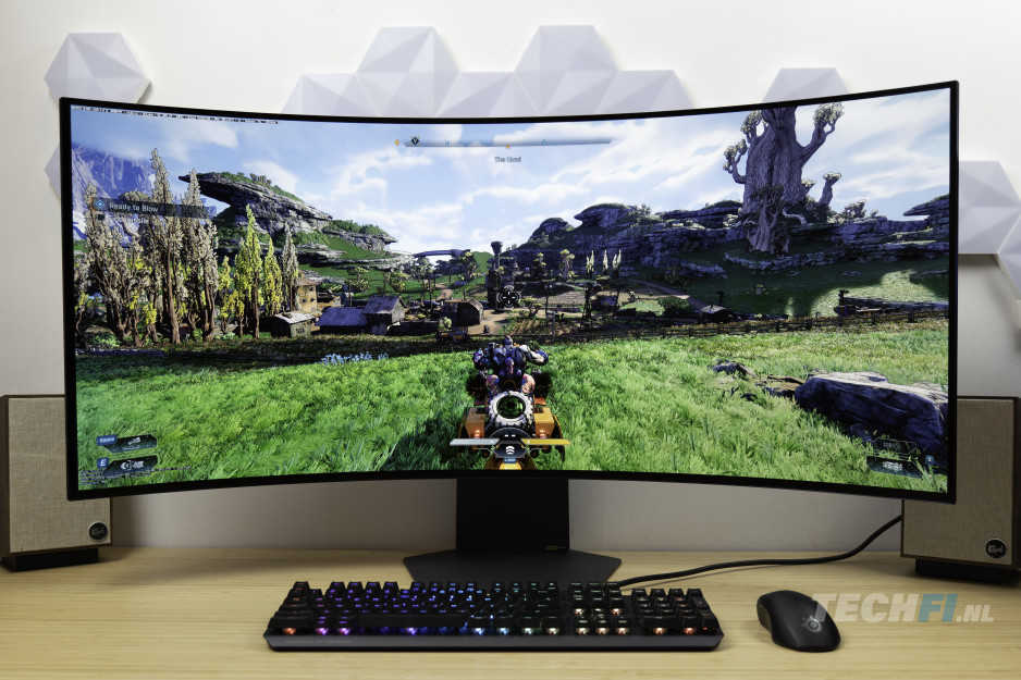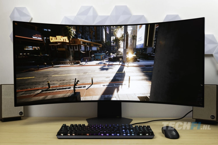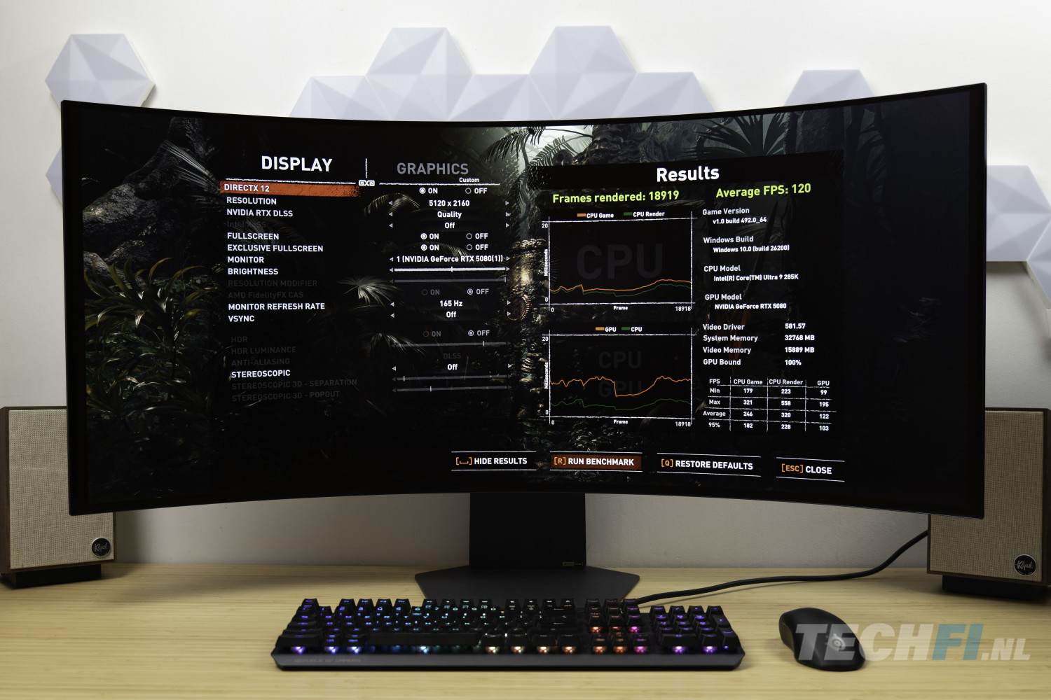 Daarbij is het vermeldenswaard, dat je nog best aardige beeldprestaties kan verwachten - tenminste, met een RTX 5080 zoals de door ons gebruikte Asus TUF Gaming, en met een dosis DLSS upscaling. Daarmee kan je snelheden rond de native refresh rate van de GX9 realiseren. Zonder AI upscaling worden met name moderne games wel een fikse dobber, ook voor een behoorlijk potente videokaart als deze. Beschik je over een langzamer model, dan moet je je wellicht afvragen of je niet beter een wat minder veeleisend beeldscherm kan kiezen.