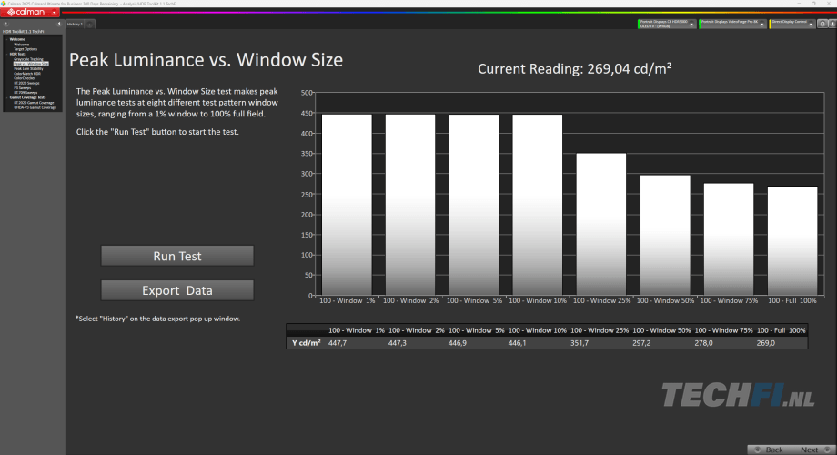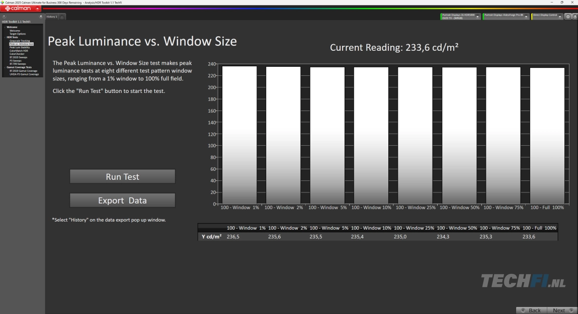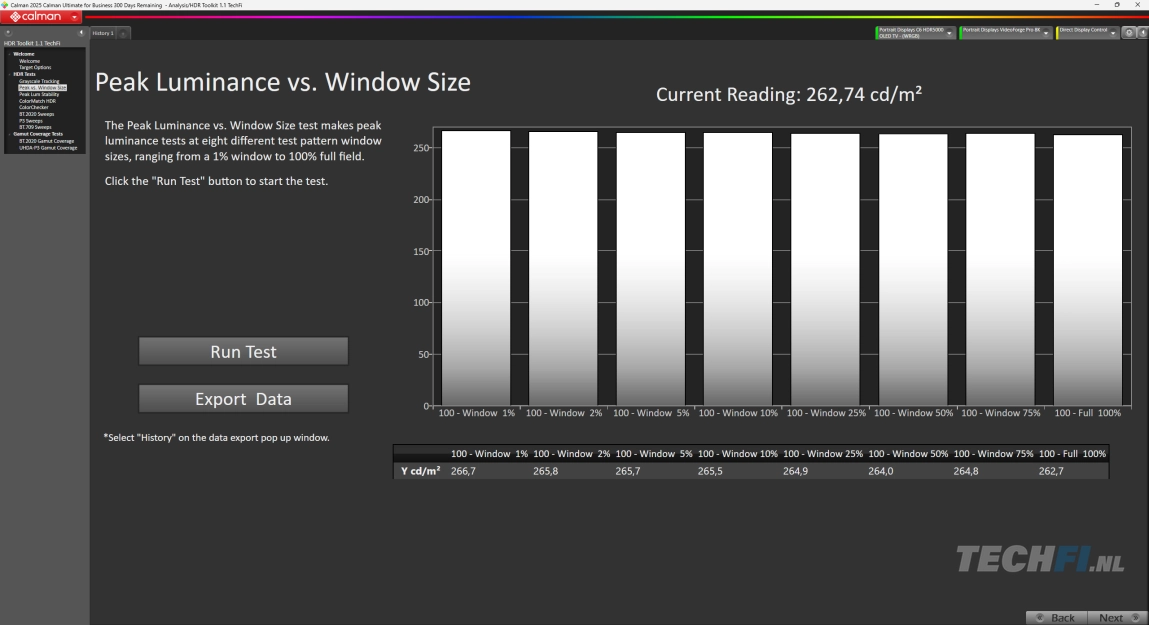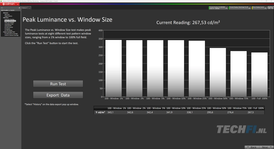 Zoals je kan zien is de maximale helderheid bij een volledig wit scherm standaard bij een helderheid van 95% afgerond 234 nits. Dat loopt iets op bij kleinere vensters, maar dat verschil zie je niet. Bij 100% helderheid is het overigens afgerond 280 nits. Met Peak Brightness op Low neemt de helderheid voor vensters tot 25% toe naar rond de 340 nits, om bij een volledig wit scherm te dalen naar afgerond 268 nits. Op 'High' kom je tot 10% grote vensters iets boven de 440 nits uit, maar een volledig wit scherm is amper helderder.