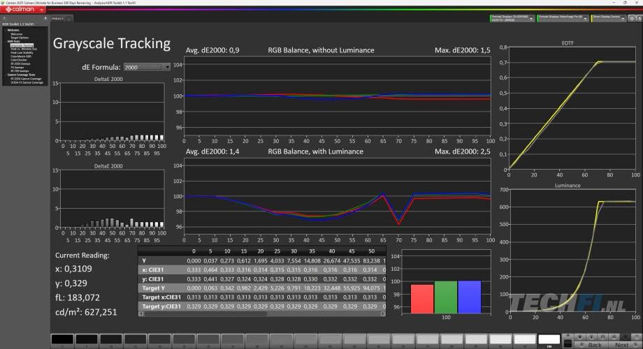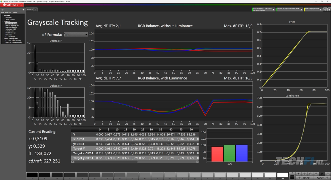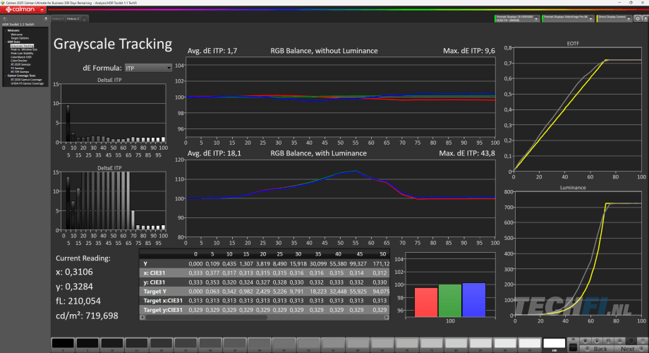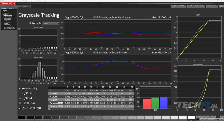 Daarbij piekt de helderheid tot iets boven de 630 nits, in een 10% venster. In de instelling 'High' krijg je veel fellere hooglichten te zien, zij het wel in heel kleine delen van het venster. Een 1%-venster komt ruim boven de 1300 nits uit, een 2% venster er net onder. Bij 5% duikt de helderheid al ruim onder de 1000 nits. Vanaf 25% vensters en groter is er geen waarneembaar verschil met de Low-instelling. Kijken we in detail naar de grijswaardemetingen, dan is de helderheidsfout bij de High instelling duidelijk hoger; niet alleen hooglichten, maar ook middentonen worden helderder gemaakt. Dat is iets wat LG zou kunnen verbeteren, want het vermindert de impact enigszins.