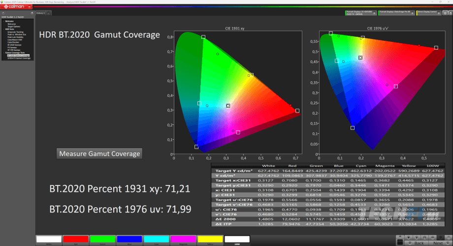 Helderheid wit (10% APL, Peak Brightness uit) Gamer 1, Gamma 2 (vs P3) DCI-P3 (vs P3) sRGB (vs sRGB) Peak Brightness Low HDR Peak Brightness High HDR |