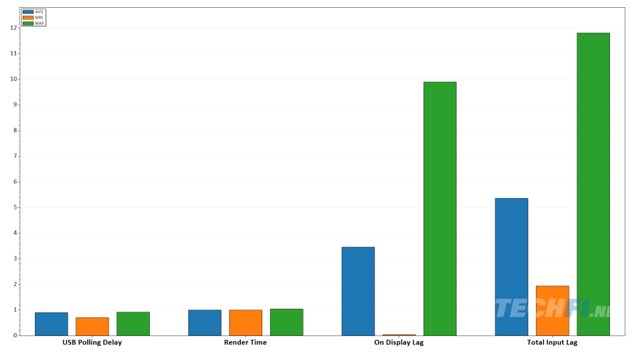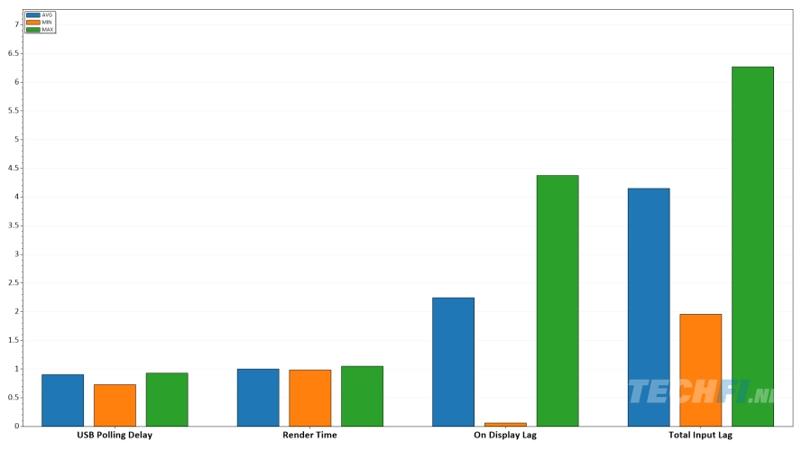 Ook op het vlak van input lag is er niets te klagen. Zowel in 330 Hz als 165 Hz zijn de testresultaten zeer goed. De gemiddelde on-display lag bij de standaardsnelheid is 3,3 milliseconden, de totale input lag blijft gemiddeld ruim onder de 6 ms steken: minder dan 1 frame dus. Op 330 Hz ligt de invoervertraging nog lager: gemiddeld 2,3 ms voor een beeld vertoond wordt, en gemiddeld 4,2 ms voor de totale input lag.
