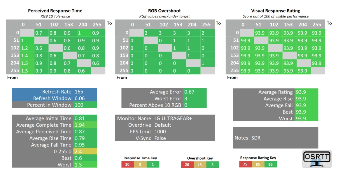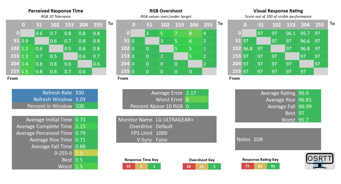 Een positieve indruk tijdens een flinke periode gebruik is een ding, maar meetresultaten zeggen ook veel. We beginnen maar met de beeldsnelheid. Het scherm kan 330 beelden per seconde weergeven in de 2580x1080 resolutie en 165 in native 5120x2160. Blijkens de test met OSRTT wordt die snelheid moeiteloos behaald. Alle pixeltransities zijn snel genoeg om beelden zonder ghosting of overdrive-artefacten te tonen. Dat is bij oled eigenlijk altijd het geval. Soms zien we in de testresultaten wel uitschieters, die veroorzaakt worden door helderheidsverschillen tussen de eerste en latere transities. Daar is hier geen sprake van. Het is gewoon een razendsnel scherm. Mocht je willen gamen in dual mode op 330 Hz, dan kan dat uitstekend.