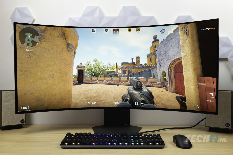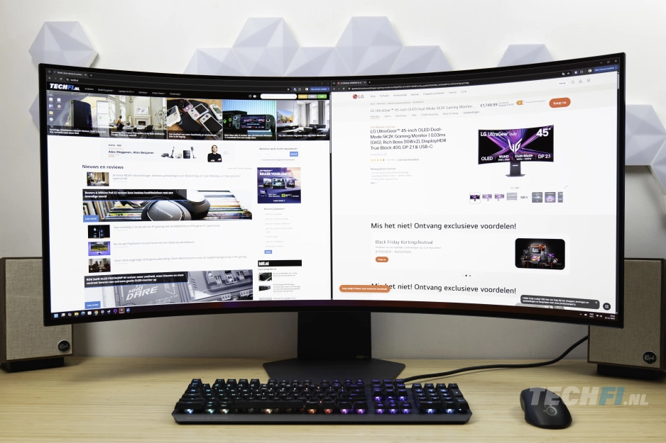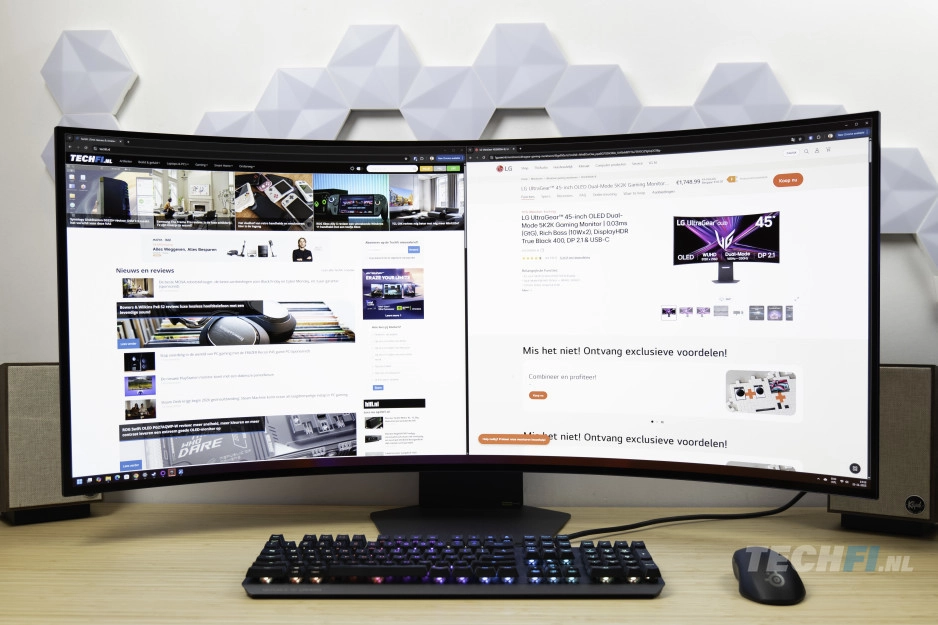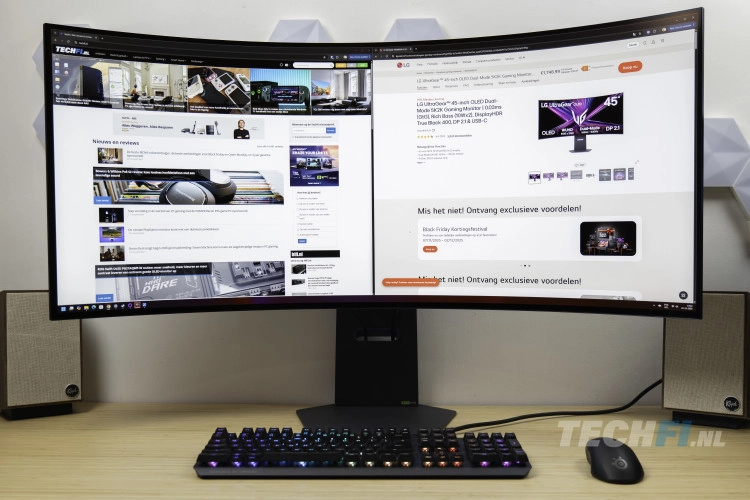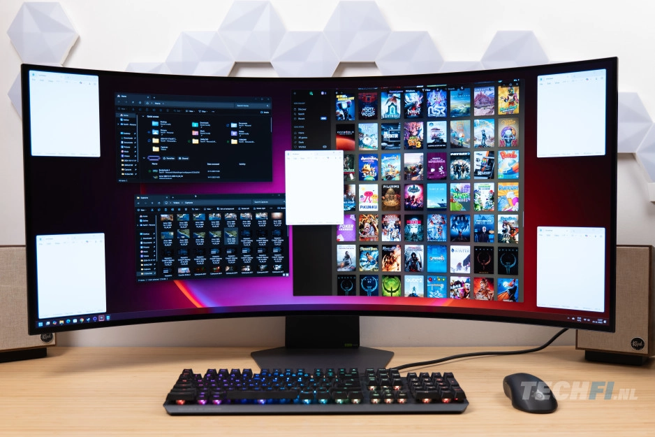 De tweede consequentie is letterlijk de prijs. De eerste 45-inch curved monitor van LG was al niet goedkoop (1899 euro bij introductie), deze opvolger kost nog 100 euro meer. Op moment van schrijven is de prijs gedaald naar 1749 euro, maar of die beklijft na het koopjesseizoen is afwachten. Er zijn immers vooralsnog geen concurrenten met dezelfde eigenschappen. Ter vergelijking, een 'gewone' 4K 240Hz 32-inch oled-monitor heb je met wat zoeken voor 1000 euro - of minder, zeker deze maand. De 45GS95QE kost momenteel ook zoiets. De 45GX950A, ook wel GX9 genoemd, zit op een vergelijkbaar niveau als de Samsung Odyssey Neo GN95C. Die 57-inch dubbel-4K miniled monitor is qua meeslependheid de enige die zich kan meten met deze LG.