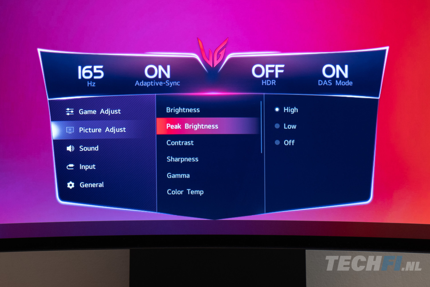 De GX9 is 'DisplayHDR True Black 400' gecertificeerd, maar heeft geen specifieke preset voor die instelling, die de meest natuurgetrouwe weergave zou moeten tonen. De enige opties in het menu om de hdr-weergave te beïnvloeden zijn de Peak Brightness keuzes: uit, low en high. Standaard staat het scherm op Low.