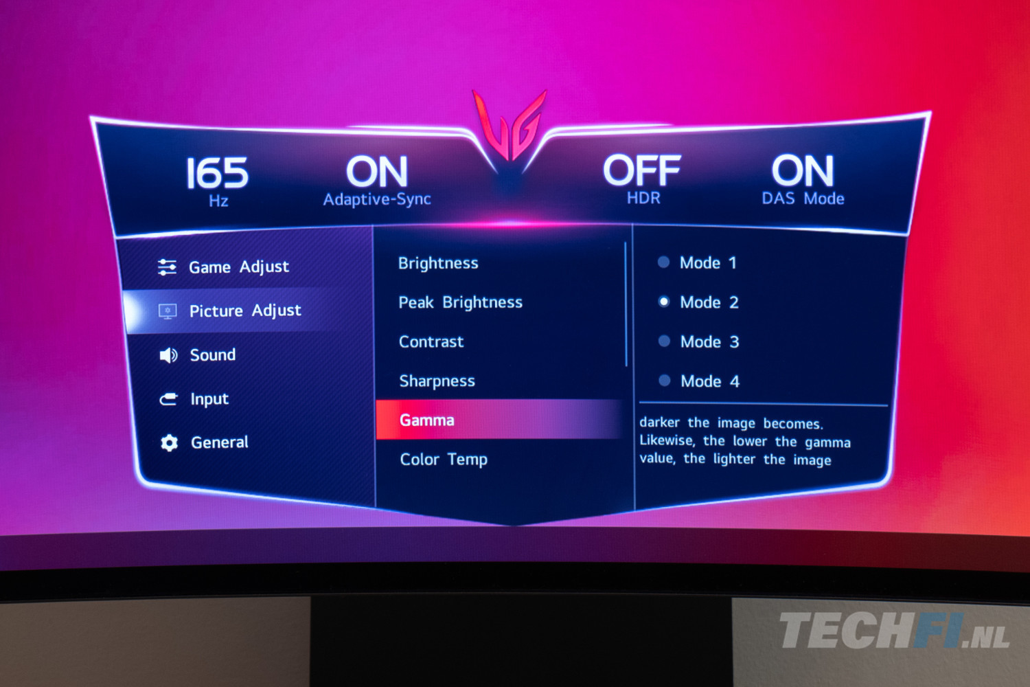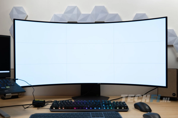 De belangrijkste kenmerken van het paneel van de UltraGear 45GX950A zijn al aan bod gekomen. Het is sterk gebogen, met een 800R curve. Dat houdt in dat het onderdeel uitmaakt van een denkbeeldige cirkel met een radius van 80 cm. Op die afstand zit je dus precies 'in het midden'. Dichterbij zorgt voor een nog meeslepender ervaring. Als oled-paneel blinkt het uit met een oneindig contrast en groot kleurbereik. Wel is het duidelijk nog geen zogenaamd Meta 3.0 oftewel tandem oled paneel. De helderheid is zeker niet slecht, maar de laatste generatie oled (zowel van Samsung als van LG Display) is nog beter.