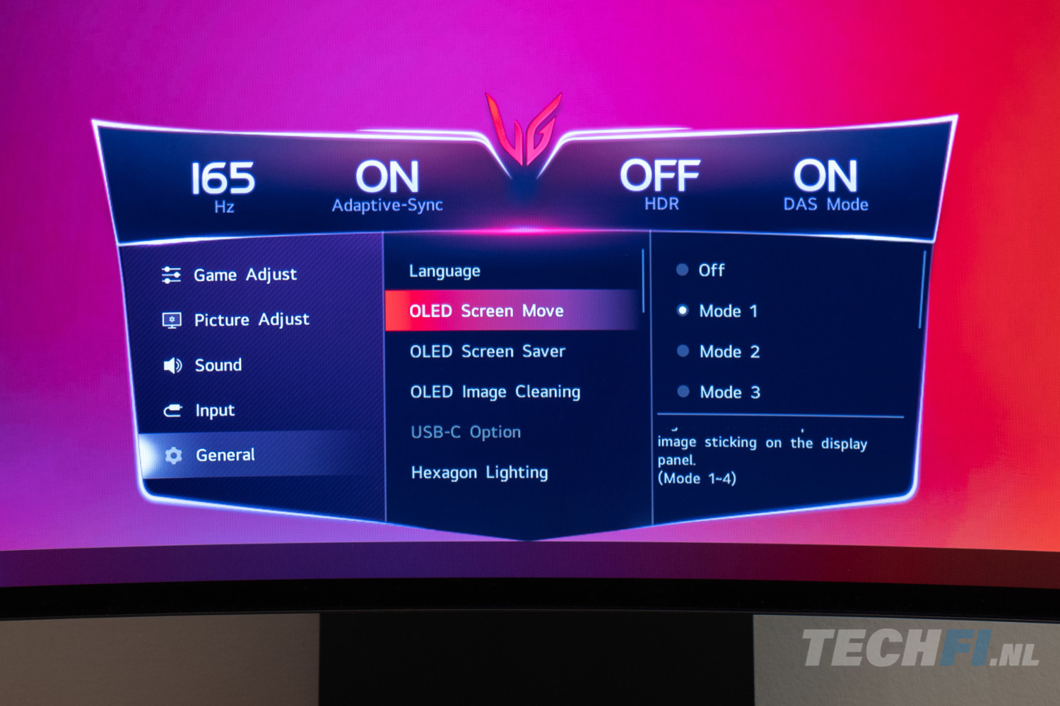 Een ander aspect dat genoemd moet worden voor deze monitor, is de oled-bescherming. Zoals gezegd biedt het menu beperkte mogelijkheden deze in te stellen. Veel meer dan hele basale opties (pixelverschuiving, screen saver en pixel cleaning) is er niet. Dat wil niet zeggen dat de 45GX950A niet nog allerlei andere technieken heeft om inbranden tegen te gaan. Sommige zijn handig, zoals standaard uitvoering van pixel cleaning wanneer je het scherm uitschakelt. Andere hebben ook nadelen, en daar kan je niets aan doen.