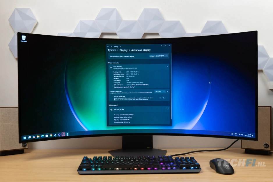 Deze toename in resolutie komt wel met een prijs. In de eerste plaats is de beeldsnelheid van de 45GX950A met 165 Hz lager dan die van de 45GR95QE (en de opvolger daarvan, de 45GS95QE). Die toonde namelijk 240 beelden per seconde, mits je videokaart daartoe in staat was. Of dat een bezwaar is, dat moet je zelf bepalen. Hoe dan ook stelt deze monitor wel fors hogere eisen aan de rekenkracht van je videokaart, als je ook deze lagere native refresh rate wilt benutten.