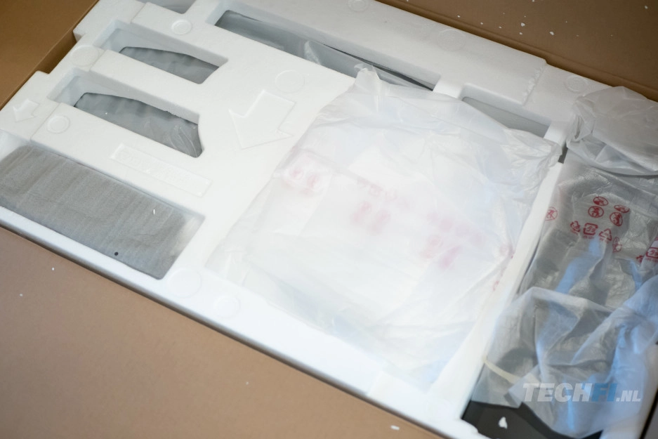 Daarmee komen we op het scherm zelf. LG levert het in een - vanzelfsprekend - enorme doos. Die is gevuld met - minder vanzelfsprekend, maar helaas nog zeer gebruikelijk - heel veel piepschuim. Daarin verpakt zitten het paneel, en de voet in twee onderdelen. Ook in de verpakking: een kartonnen doos met daarin kabels en de externe voedingsadapter. Die is gigantisch en moet je dus ergens een plekje geven. Een interne voeding heeft wat mij betreft sterk de voorkeur. Het creëert natuurlijk een extra ontwerpuitdaging, want de voeding produceert warmte, wat niet wenselijk is bij een oled-paneel. Maar genoeg concurrenten laten zien dat het wel degelijk kan.