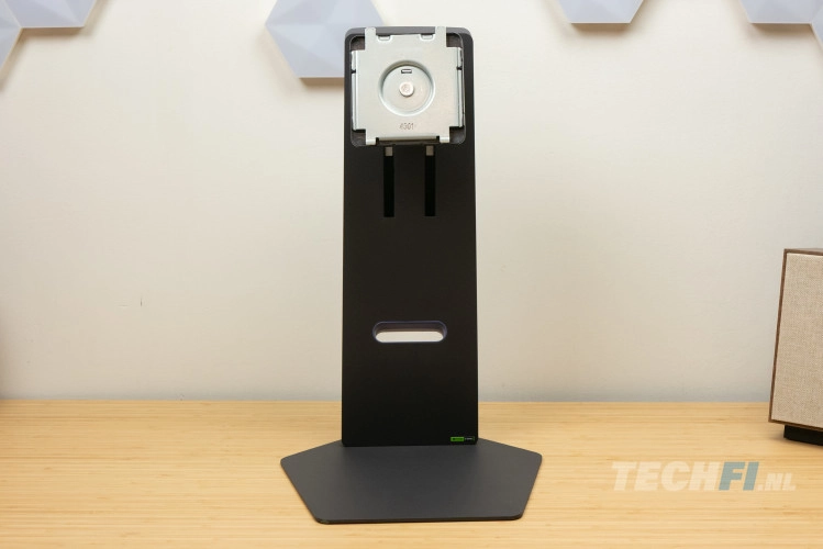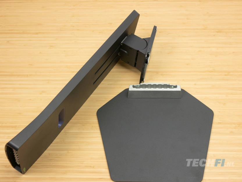 Het monteren van het scherm is eenvoudig. De enorme verticale staander schroef je met twee duimschroeven vast aan de zware metalen bodemplaat. Het geheel klik je achterop het paneel en zo til je het uit de doos. Dat vergt enige krachtinspanning, maar het gewicht blijft onder de 10 kilo en dat valt eigenlijk nog best mee. Het is toch een scherm van een meter breed (en 113 cm diagonaal).