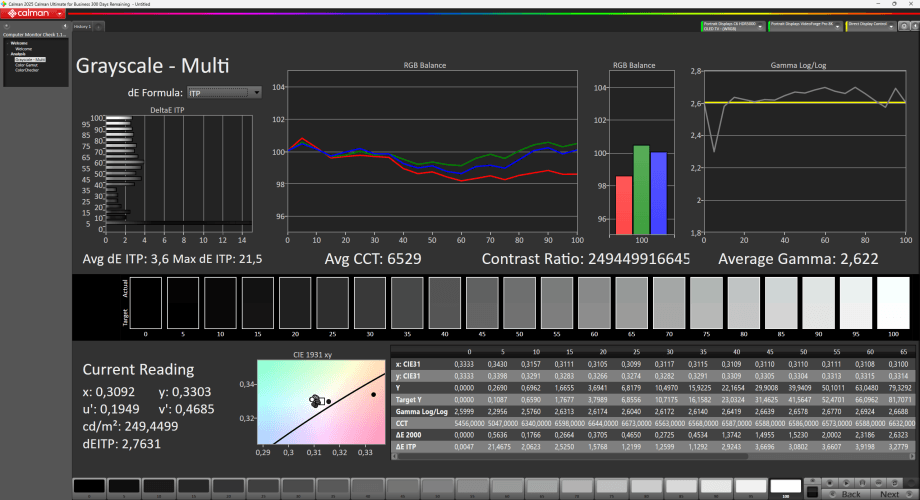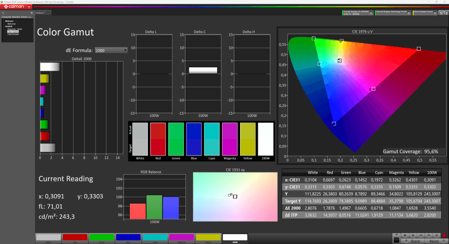 De DCI-P3 preset is wat minder indrukwekkend. Weliswaar is er geen daling van de kleurdekking (die is sowieso net iets lager dan bij veel andere oled-monitoren), maar ook geen toename in nauwkeurigheid. De preset is geoptimaliseerd voor materiaal in gamma 2.6, wat correct is voor de standaard, maar materiaal in gamma 2.2 erg donker toont. De kleurtemperatuur is wel net wat neutraler. Een aparte Display P3 preset met gamma 2.2 zou mijn voorkeur hebben, mits beter gekalibreerd. Feitelijk is de standaardinstelling daar al ruimschoots toereikend voor.