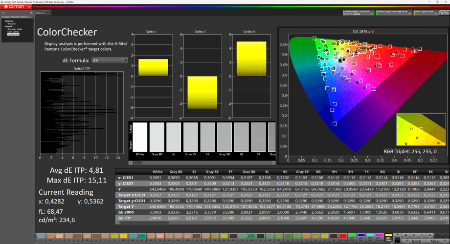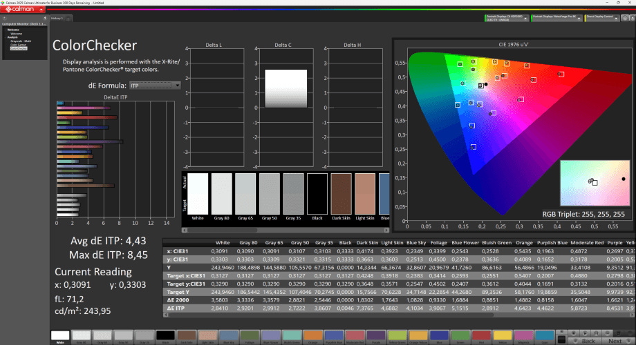 Zoals elke UltraGear monitor die ik tot dusver heb getest, staat de 45GX950A standaard in de preset 'Gamer 1' met 'Gamma 2' in het betreffende menu. Daar heb ik dan ook in de eerste plaats tests op gedaan, aangezien de meeste mensen het menu niet snel induiken. Daarnaast heb ik op dezelfde wijze met Calman Ultimate van Portrait Displays de DCI-P3 modus getest, en de sRGB-modus, waarover hieronder meer. Om maar met de deur in huis te vallen: wie nooit het menu aanraakt, hoeft niet te vrezen. De beeldkwaliteit in de standaardmodus is uitstekend. Zowel kleur- als grijsafwijkingen zijn extreem laag, onder of rond de 1 op basis van dE2000. Ook de kleurtemperatuur is prima: iets aan de warme kant, maar zeer acceptabel.
