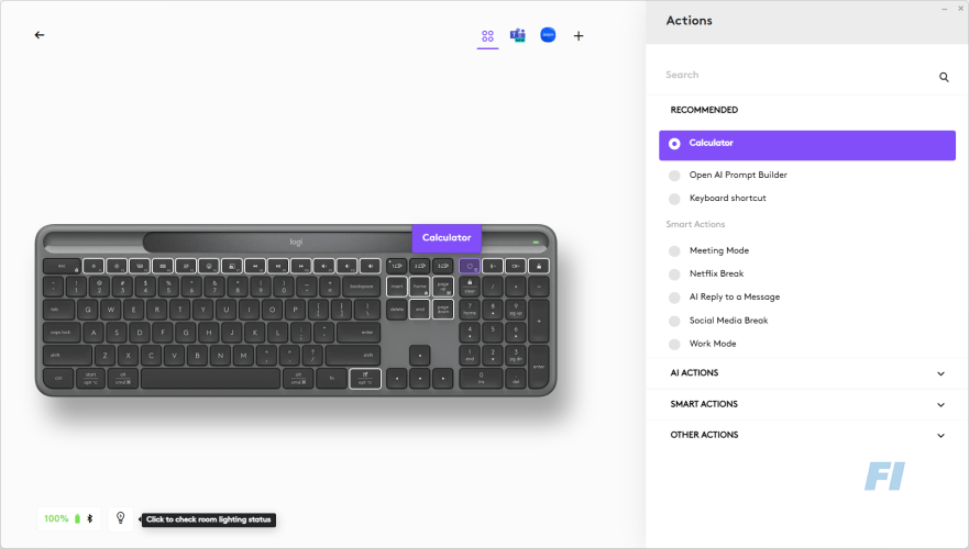 De drie schakeltoetsen voor Easy Switch (zoals Logitech het wisselen tussen aangesloten apparaten noemt) nemen ook plek in, en boven het numerieke eiland zitten nu een cirkel-toets en knoppen om de microfoon te dempen, de camera uit te schakelen en een systeemvergrendelentoets. Die cirkel lijkt de Actions Ring op te roepen, maar standaard roept deze de secundaire functie aan: de rekenmachine. Je kan hem koppelen aan zogenaamde Smart Actions, wat een soort macro's zijn.