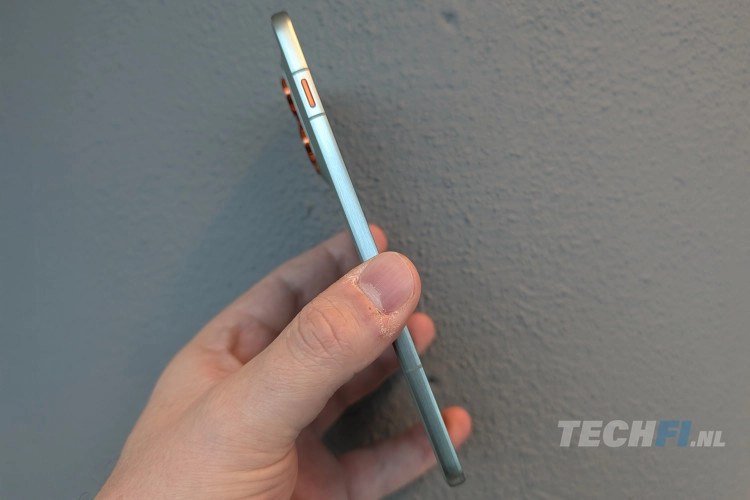Naast de kleuren onderscheidt de smartphone zich vooral door zijn gewicht van 159 gram (20 gram minder dan de Edge 60), en een dikte - op het dunste punt - van 5,99 millimeter. Ter vergelijking: de Galaxy S25 Edge weegt 163 gram, de iPhone Air 165 gram. Qua dikte zijn die twee nog net een fractie dunner, met respectievelijk 5,8 en 5,64 millimeter. De iPhone Air heb ik nog niet vastgehad, maar de S25 Edge voelde behoorlijk in balans in de hand. Datzelfde geldt voor de Motorola Edge 70, misschien nog wel meer. Het is een erg prettig toestel om vast te houden, met aan de onderkant glooiende lijnen. De zijkanten zijn deels recht, deels iets taps toe gepolijst, wat ook aangenaam aanvoelt.