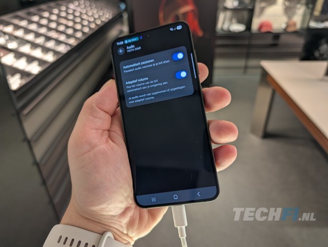 Ook goed om te weten: je kunt dat led-lampje niet afplakken. Tenminste, dat kun je wel doen – maar dat detecteert de bril, waardoor je niet meer in staat bent om te filmen. Dat komt door de lichtsensor op het apparaat. Verder schakelt de bril zodra je hem van je hoofd haalt; hij gaat weer aan wanneer je hem opzet. Opladen gaat via een draadloze oplaadcase. Zodra je de bril erin doet, begint die meteen met laden.