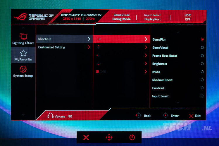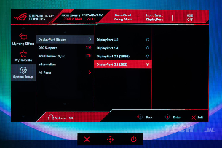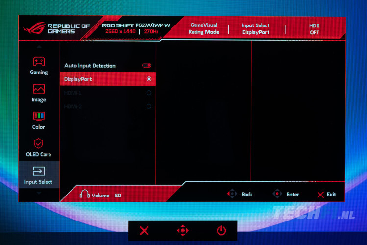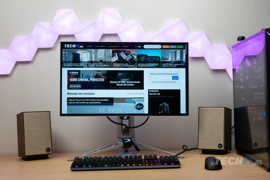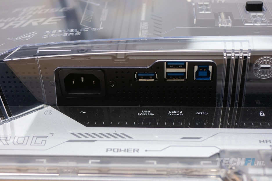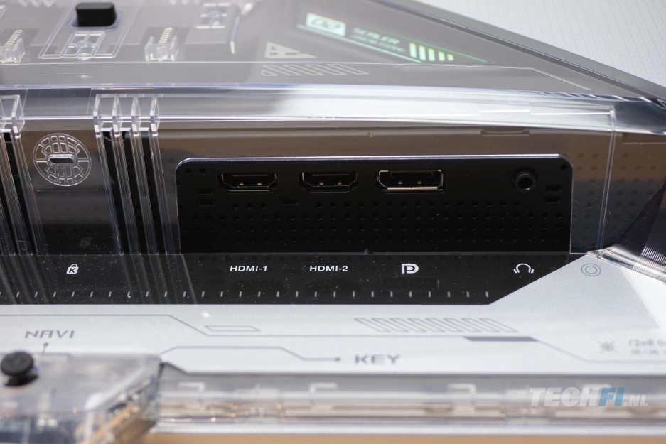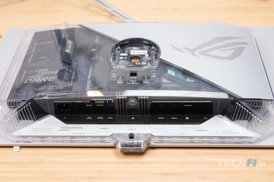 Qua aansluitingen biedt Asus de essentie en een klein beetje meer: een keer displayport 2.1, twee hdmi 2.1-ingangen en een usb hub met drie downstream poorten. Usb-c is niet beschikbaar, ook speakers zijn niet ingebouwd - zoals eigenlijk nooit bij de topmodellen van ROG. Je moet het doen met een hoofdtelefoonuitgang. Gezien de doelgroep is dat begrijpelijk, consolegamers kunnen met minder extreme oled-monitoren ook toe.