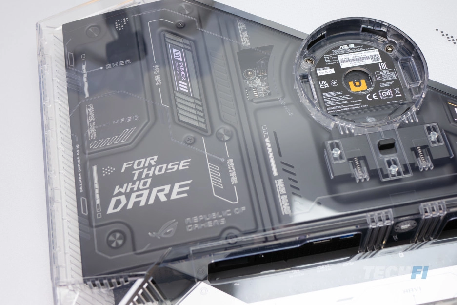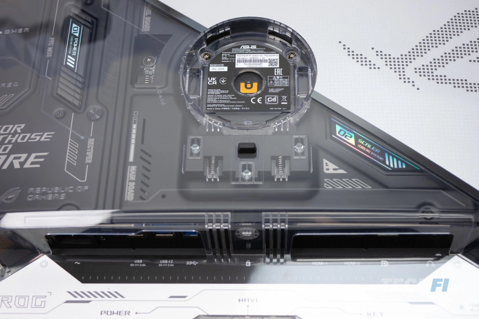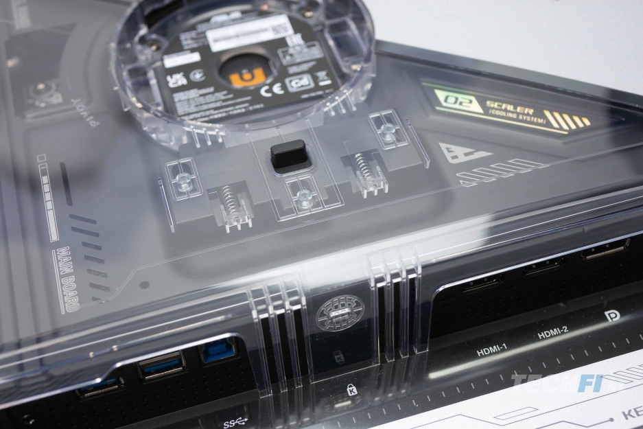 Bovenal opvallend is de achterzijde doordat deze voor een groot deel transparant is. Zo heb je een blik op de aansturende (en deels gelabelde!) elektronica van het paneel en zelfs het mechanisme waarmee het paneel vastklikt op de voet. Het witte deel van de achterkant bevat de tegenwoordig voor deze lijn kenmerkende matrix-verlichting, met tientallen oplichtende stippen.