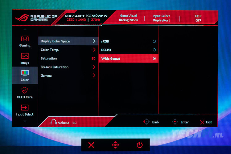 Dat is bij de ROG Swift OLED PG27AQWP-W een w-oled paneel van LG Display. Het is een zogenaamde meta 3.0 exemplaar. Waar eerdere w-oled gaming monitoren gebruikmaakten van meta 2.0 met een micro-lens array (mla) laag om reflecties te verminderen, is hier sprake van een andere techniek. Met vier in plaats van drie oled-lagen (twee blauwe, een rode en een groene) biedt het scherm aanmerkelijk meer helderheid en een groter kleurbereik. Met name blauw is aanmerkelijk verzadigder. Waar eerdere schermen net niet de 100% van de dci-p3 kleurruimte afdekten, doet deze dat wel. Dat zien we ook in onze metingen terug, waarover uiteraard verderop meer. Ook de BT.2020 dekking is wat hoger.
