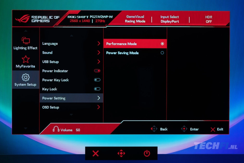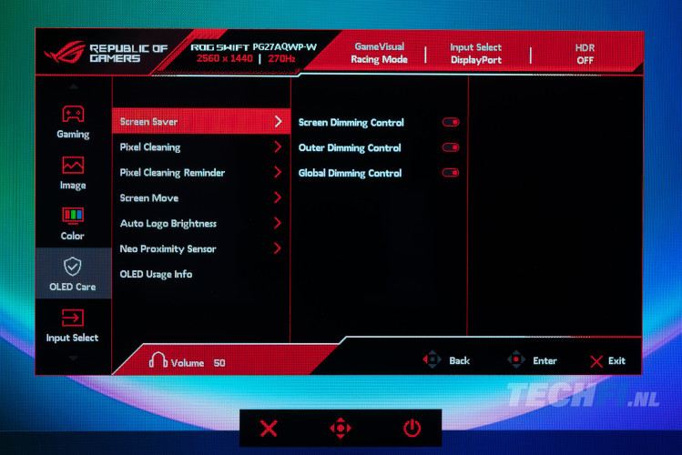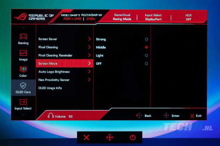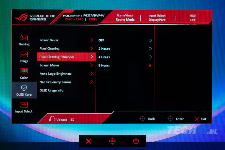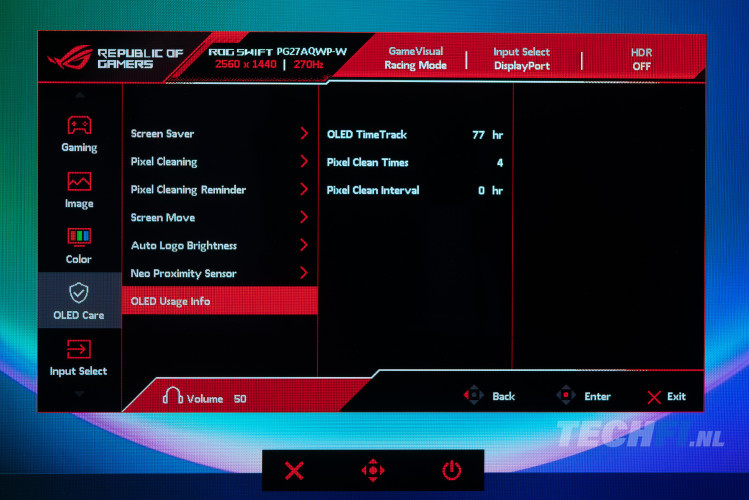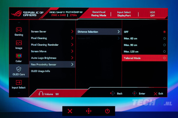 Hierboven zijn we al ingegaan op wat voor paneel je voor je hebt. De ervaring in de praktijk is eigenlijk conform de belofte. Diepzwart en met een zeer hoge verversingsfrequentie. De oled features werken als vanouds. Met name de nabijheidssensor is iets wat elk oled-scherm van ons mag hebben. Je kan 'm tegenwoordig ook instellen op een afstand naar wens, naast de presets. Overigens staat het scherm direct uit de doos in een soort energiebesparende modus, waarin de meeste instellingen niet toegankelijk zijn. Bij eerdere monitoren kreeg je daarover een waarschuwing te zien, maar net als bij de XG27AQDPG is dat hier niet het geval. Schakel dus voor je iets anders doet over naar de prestatiemodus (via System Setup > Power Setting).