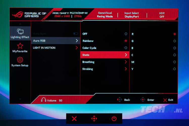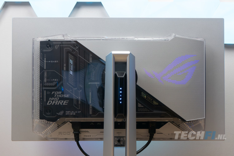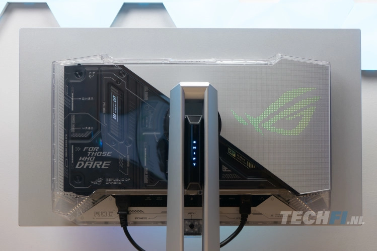 Zo zijn de poten van de aluminium voet niet massief, maar opengewerkt. Daardoor oogt het geheel lichtvoetiger, en weegt het direct ook wat minder. In plaats van rode lichtaccenten zijn ze hier blauw, zowel voor het ROG-logo onder de onderrand als naar onder geprojecteerde. Dat laatste kan je met de genoemde inzetjes aanpassen, zo je wilt. Het meest opvallend is echter de achterkant. Die is niet zwart, zoals elk ander ROG-scherm, maar wit.