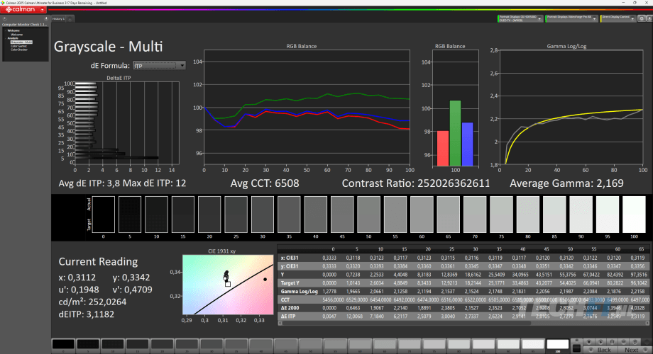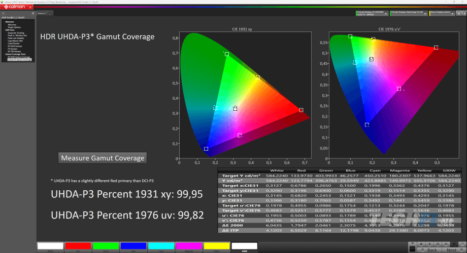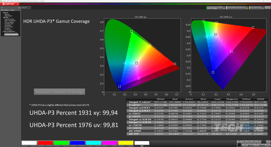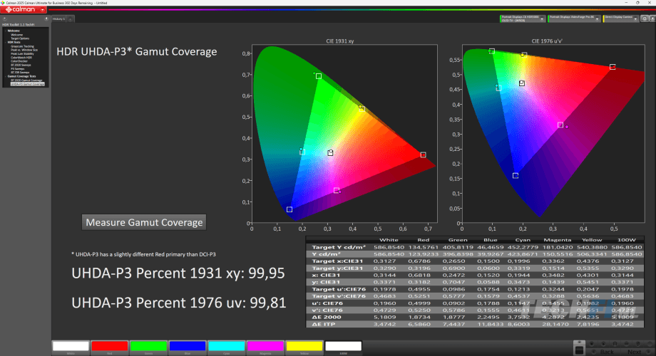 Tot slot de User Wide Gamut modus. Ook hier 99,9% dekking van DCI-P3, maar een nog lagere kleurafwijking (dE2000: 1,6, dEITP 4,1), een lagere grijsafwijking (dE2000: 1,6, dEITP: 2,9) en een neutralere kleurtemperatuur van 6451K. Weliswaar is groen nog steeds wat te dominant, maar wel zichtbaar minder. Dit is dan ook de stand die ik zou adviseren voor normaal gebruik, los van eventuele aanpassingen die je zelf doet.