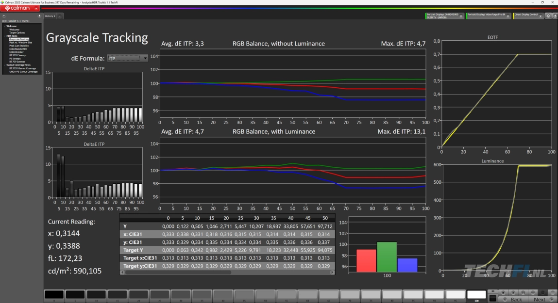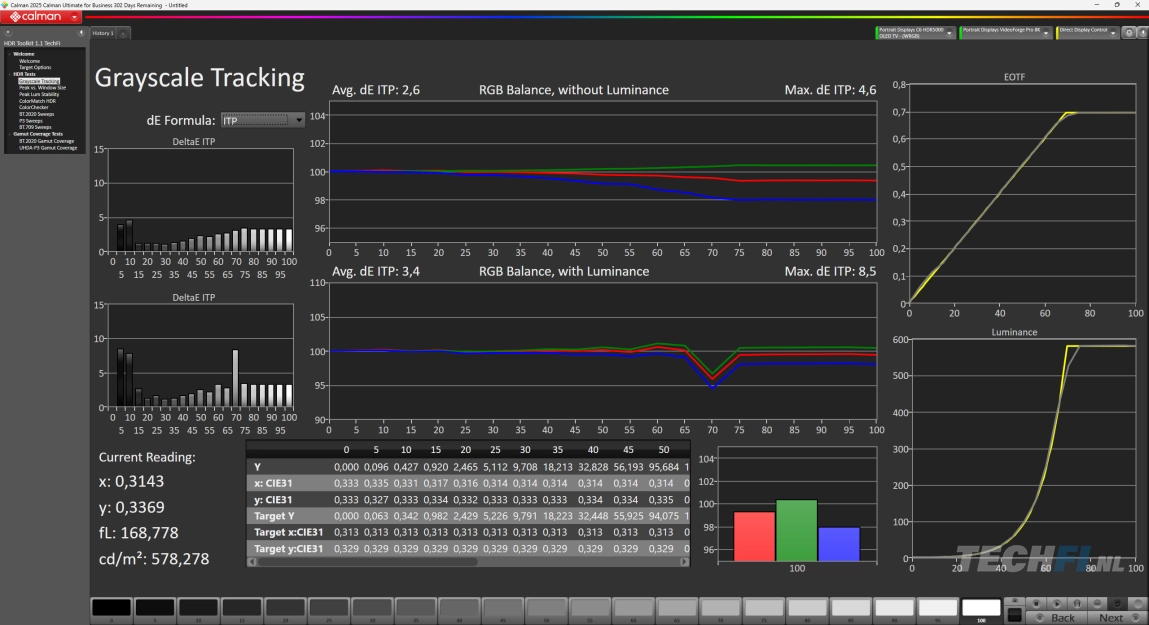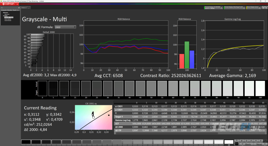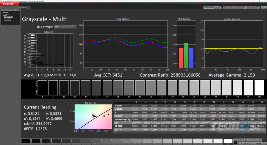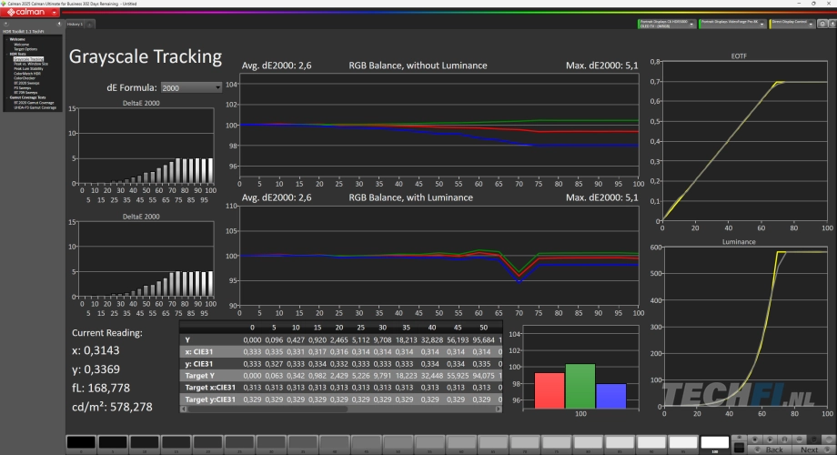 De kleurweergave is zeer goed, met 79,6% dekking van de BT.2020 kleurruimte en 99,82% dekking van P3. Dat zijn waardes die vergelijkbaar zijn met qd-oled monitoren, die hier doorgaans betere cijfers tonen dan w-oled panelen. Met tandem oled haalt LG Display die achterstand duidelijk in. Ook de kleurnauwkeurigheid is van hoog niveau, met gemiddeld 5,9 afwijking op basis van dEITP in de uitgebreide ColorChecker test. Ook het ColorMatch HDR resultaat van gemiddeld 9,53 (dEITP) is erg goed.