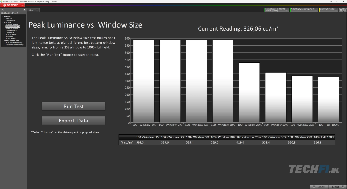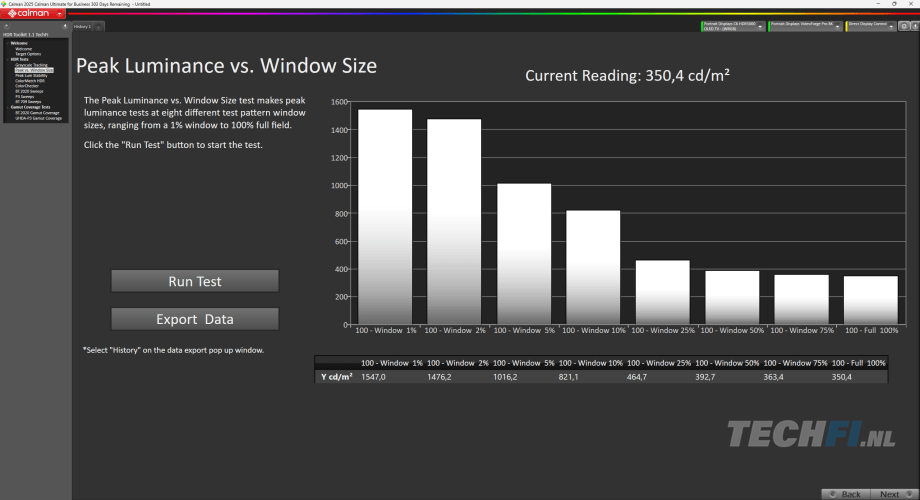 Met de hdr helderheid op 100% meten we maar liefst 1547 nits op een 1% venster en 1016 nits op een 5% venster. Het scherm waarschuwt wel dat deze helderheid effect heeft op de beeldkwaliteit, lees: de kleurechtheid. Zoiets zagen we ook bij andere Asus oled monitoren, maar die waren in de regel begrenst op 90% en piekten ook met begrenzing rond de 1000 nits. Ik heb de Gaming HDR modus op 100% helderheid doorgemeten, en dat levert inderdaad hogere kleurafwijkingen op, al valt het nog mee. Ook loopt de kleurdekking iets teerug - het mag eigenlijk geen naam hebben. Voor meer impact van hdr in games kan je rustig de helderheid opschroeven. De full-screen wit helderheid komt dan op 350 nits uit, wat ronduit indrukwekkend is voor een oled-monitor.