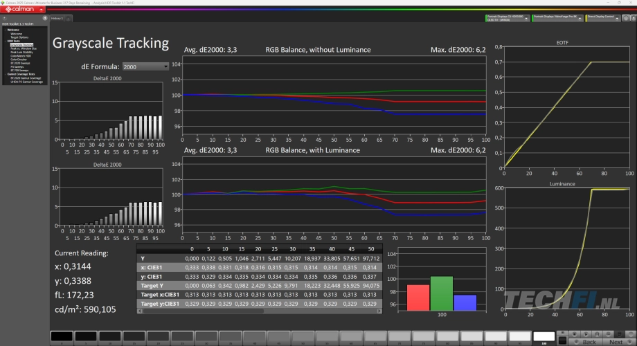 In Racing Wide Gamut is de dekking van de DCI-P3 kleurruimte 99,9%, met een zeer bescheiden gemiddelde kleurafwijking (2,3 dE2000, 5,6 dEITP). Daarvan lijkt de grijsafwijking de grootste component te zijn, die komt uit op 3,1 op basis van dE2000 en 3,5 met dEITP. De kleurtemperatuur is een redelijk warme 6250K, bij een keurig 2,2 gamma. De RGB-balans neigt wat veel naar groen, wat ook zichtbaar is in een licht groenzweem in de grijstinten.