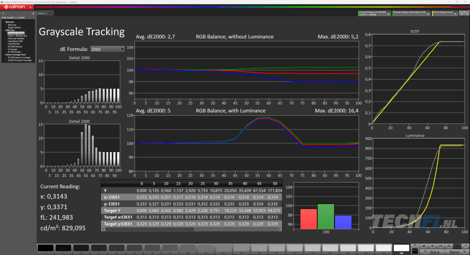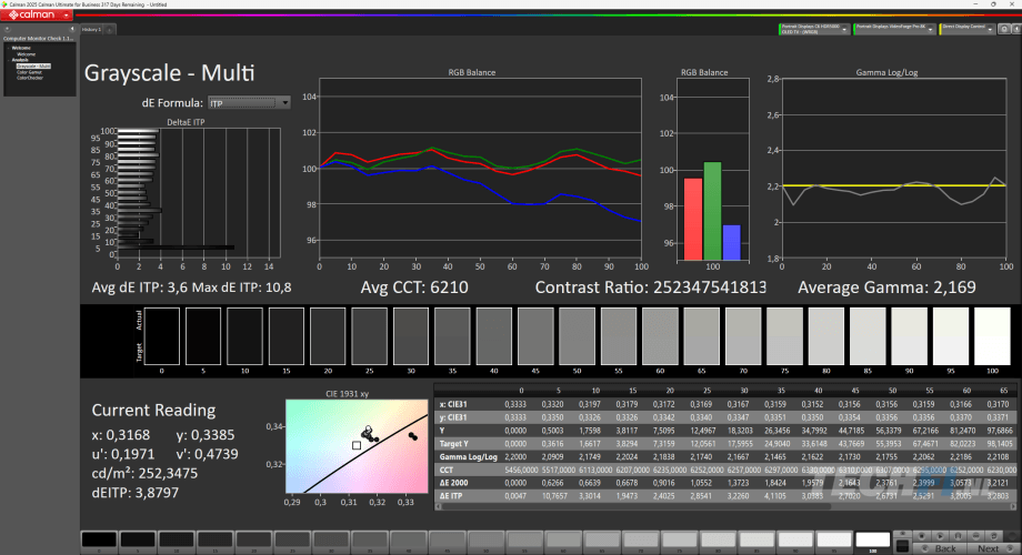 Met de DCI-P3 kleurruimte in dezelfde Racing preset komt de dekking uit op 95,2%. Iets lager wat vaak het geval is bij een betere kalibratie voor de kleurruimte. De kleurafwijking komt hier inderdaad iets lager uit (dE2000: 1,93, dEITP 5,04), al is het geen wereldschokkend verschil. Ook de grijsafwijking is wat lager, zij het wederom niet enorm veel (dE2000: 2,6, dEITP 3,4). Met een kleurtemperatuur van 6213K en een gamma van 2,19 kan je je afvragen of deze stand zoveel beter is.