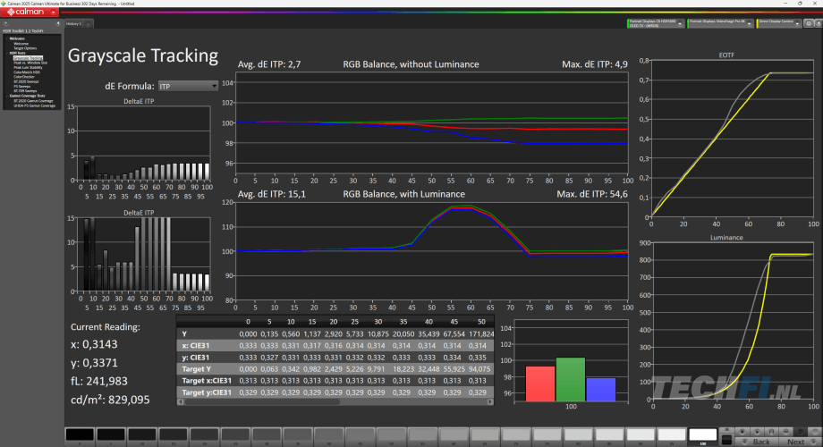 Zoals altijd biedt Asus meerdere hdr modi op de PG27AQWP-W, waarvan ik er twee heb doorgemeten. De standaardmodus is Gaming HDR, maar er is ook een gekalibreerde DisplayHDR True Black 500. Die kalibratie blijkt uitstekend, met als voornaamste kritiekpunt dat ook hier groen wat aanweziger is in de RGB-balans. De grijswaarde afwijking is echter zeer gering, ook met luminantiefout meegenomen. De piekhelderheden zijn indrukwekkend hoog, net onder de 600 nits tot een 10% venster.