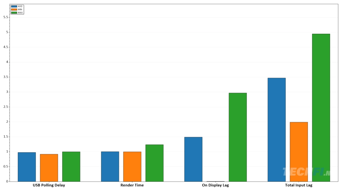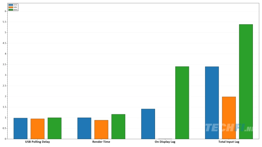 De input lag is op beide snelheden zeer laag, gemiddeld 1,5 ms on-display lag, gemiddeld rond de 3 ms. In 720Hz-modus is wel veel meer variatie zichtbaar tussen de individuele meetpunten (ik heb de test steeds 300 keer laten uitvoeren). Je kan dat zien in onderstaande grafieken.