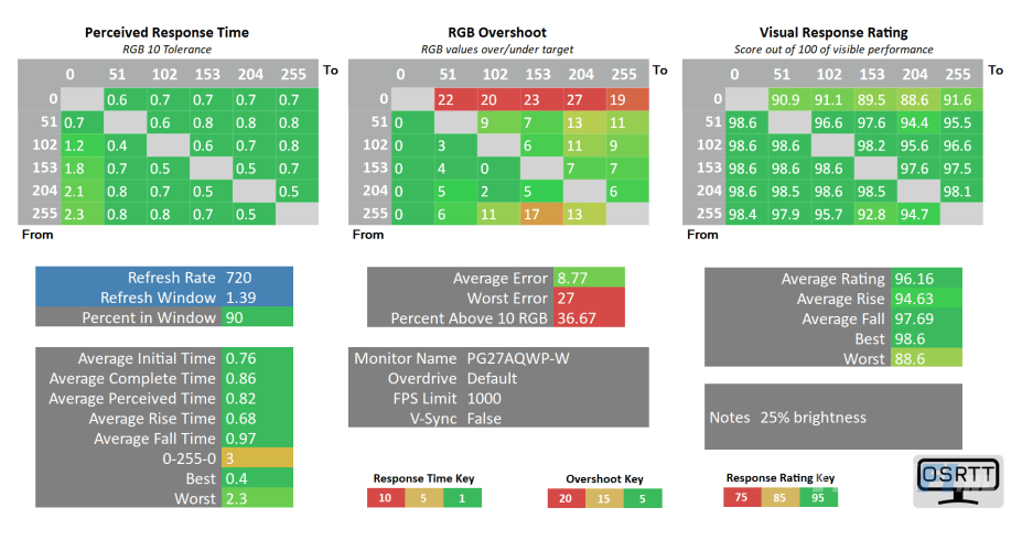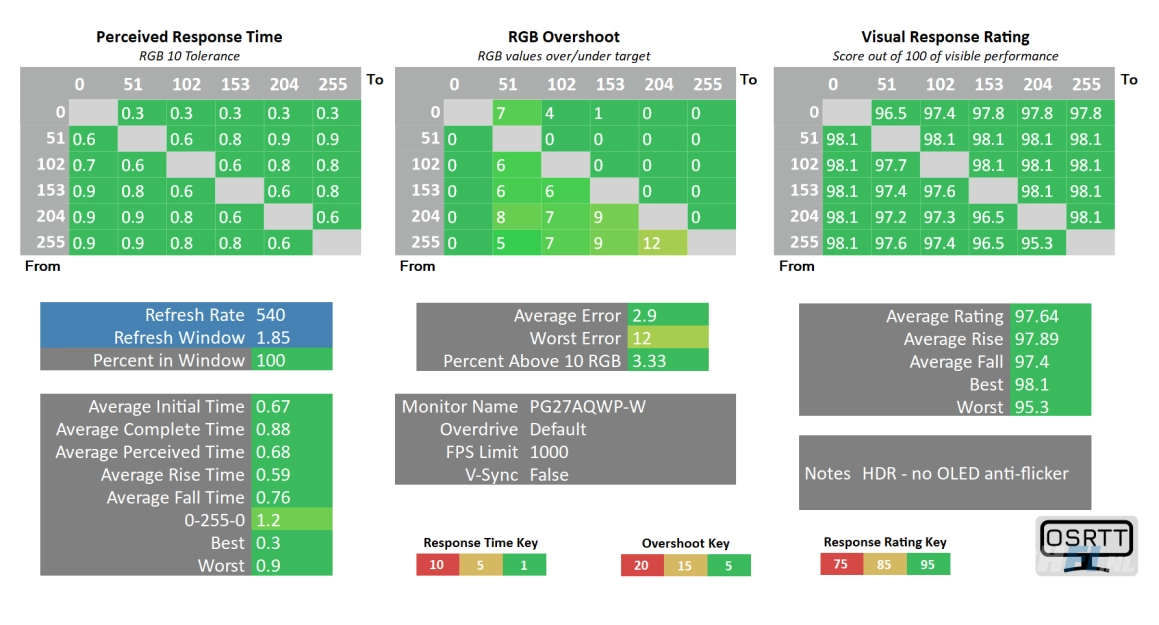 Bij het bekijken van de testresultaten met OSRTT zijn de responstijden in 540Hz-modus ongekend goed. Oled-monitoren doen het altijd goed, maar ook in dat selecte segment is de PG27AQWP-W een topper. Veel oled monitoren vertonen door hun inherente eigenschappen soms wat vreemde resultaten, maar daar is hier eigenlijk geen sprake van. Transities zijn alle binnen de 'window' van 1,9 milliseconden, met een laagste tijd van 0,4 ms en een hoogste van 1,5 ms. Ik heb zowel getest met de anti-flicker feature aan als uit, met deze functie uitgeschakeld lijken de resultaten nog iets beter. Alles onder de 1 ms, wat getuigt van grote klasse.