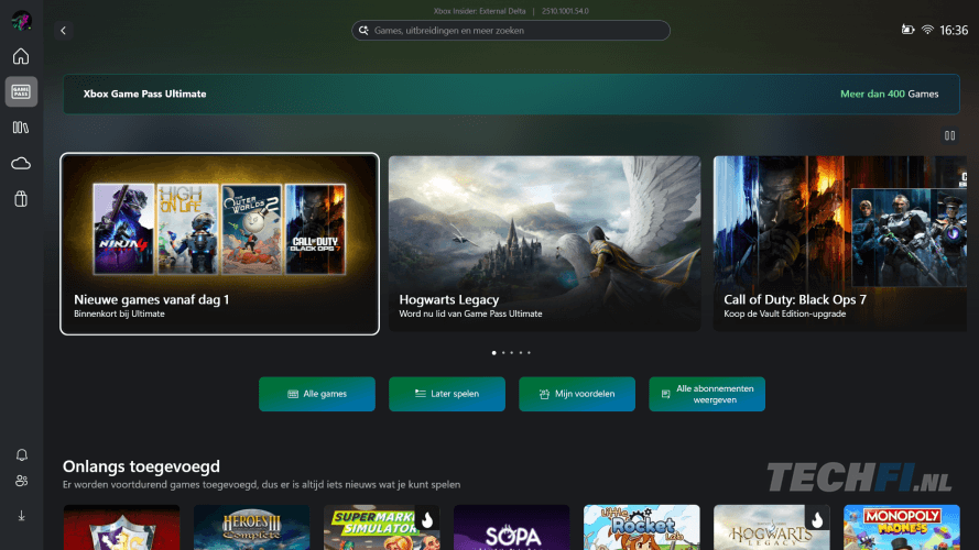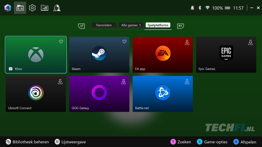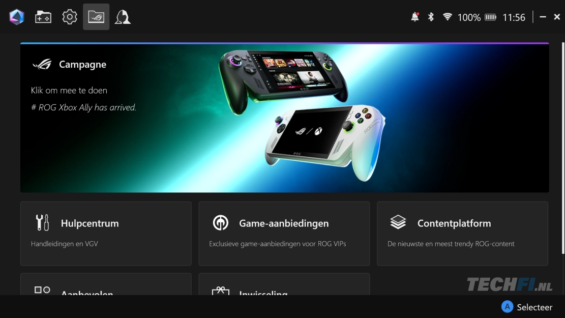 Eenmaal geüpdatet en wel starten de ROG Xbox Ally’s echter wel op in een Xbox-omgeving. Dat is de full-screen experience van de Xbox-applicatie, die pc-gamers wellicht al langer kennen. Op de Ally neemt die de vorm aan van een overkoepelende launcher, zodat je niet (altijd) door Windows-menuutjes hoeft te navigeren om een game op te starten. Noem het de console-ificatie van de pc-ervaring.