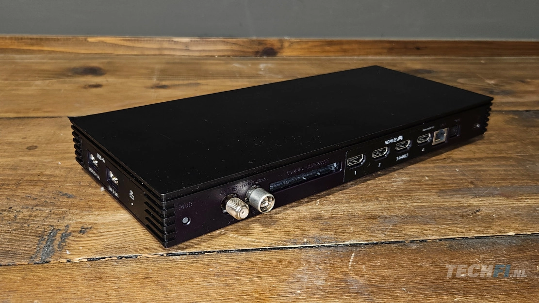 De One Connect box biedt verder twee usb-poorten, een optisch digitale audio-uitgang, een tv-tuner voor DVB-T2/C/S2 en een CI+-slot voor live tv, en een Ethernet-aansluiting. Bluetooth en WiFi (opmerkelijk genoeg slechts WiFi 5) zijn ook aan boord.