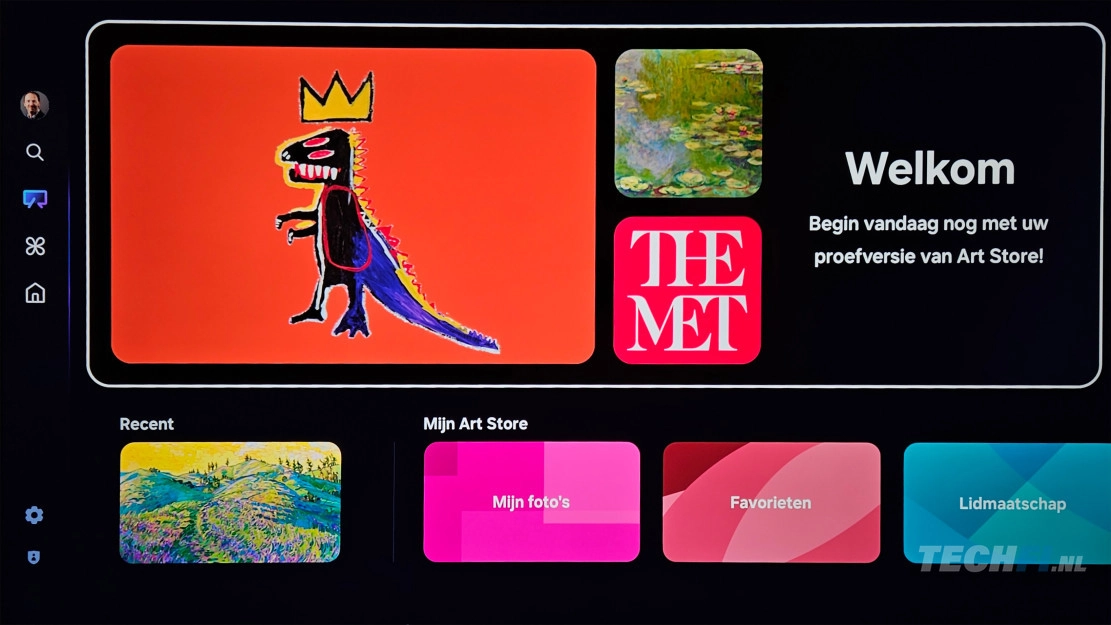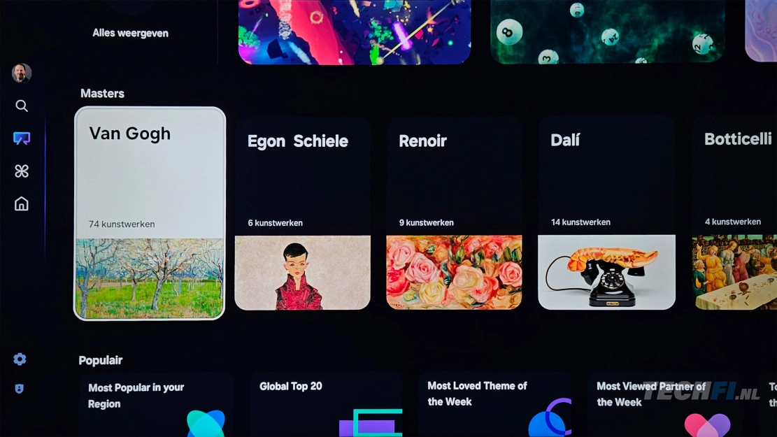 De Tizen Smart TV-omgeving blinkt vooral uit in een ruim aanbod functies. Dankzij een goede indeling van het Home-scherm verdrink je niet in het aanbod. Het Home-scherm biedt drie secties, via het menu links in beeld: Kunst (waar op andere Samsung-modellen Ambient staat), Daily+ en Start.