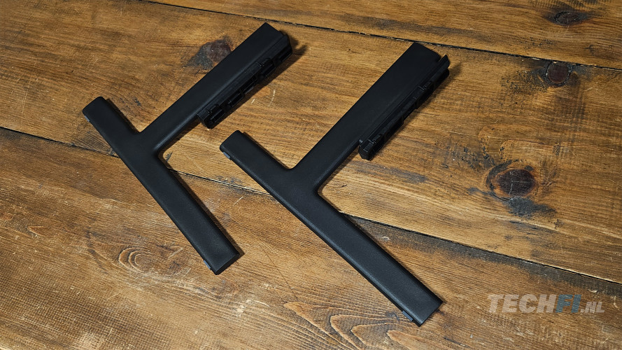 The Frame Pro wordt geleverd met een slanke wandmontagebeugel en twee heel smalle voeten. Deze voeten zijn volledig uit kunststof vervaardigd en ze schuiven met een schroefloos mechanisme in de rug. Dat kan in twee posities: hoog of laag. De voeten leken me niet zo stevig, dat mag wel iets sterker. Vooral bij zijdelingse druk lijken ze te bewegen. Een van de leuke extra’s bij een The Frame televisie is dat je het uiterlijk kunt aanpassen met magnetische lijsten. Samsung levert een exemplaar met teakhoutlook er bij aankoop bij. Extra lijsten zijn optioneel verkrijgbaar.