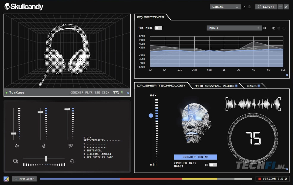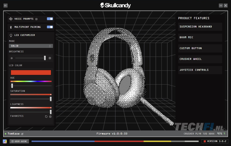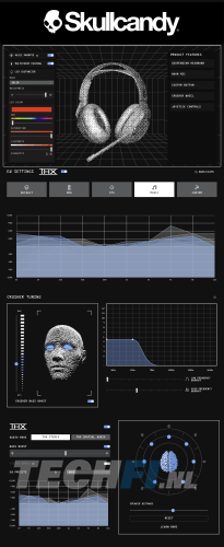 Op pc en mobiele apparaten (Android en iOS) laat de PLYR 720 zich namelijk vrijuit verder tweaken en optimaliseren. En niet zo’n beetje ook. Via de Skull-HQ en de Skullcandy-app zijn er verschillende EQ-profielen om aan te passen, mogen gebruikers een eigen RGB-kleurtje kiezen, kan THX Spatial Audio geactiveerd worden en is het mogelijk om een gehoortest van Mimi af te leggen.