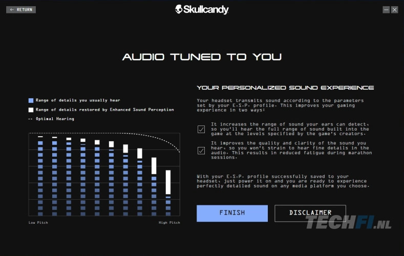 Uit dat laatste komt een persoonlijk ‘Enhanced Sound Perception’-profiel rollen, waarbij frequenties die je zelf minder goed waarneemt selectief door de headset versterkt worden. Dat zogenaamde E.S.P-profiel leidt uiteindelijk tot een rijkelijker gevulde toonbalans met significant meer nuance. Fijn is ook dat dit persoonlijke profiel losstaat van de EQ-instellingen en THX: al die instellingen zijn afzonderlijk ‘stapelbaar’.