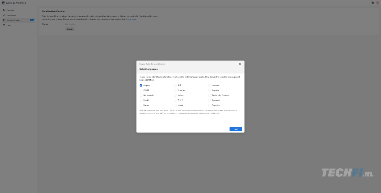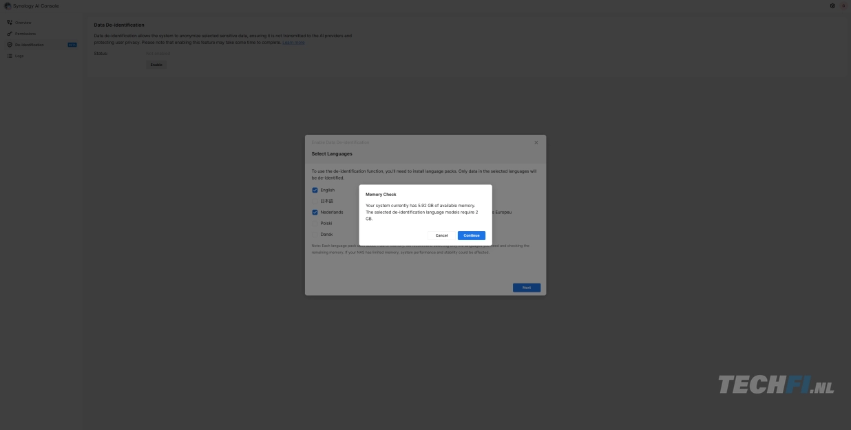 Een eerdere demo die we te zien kregen werkte op basis van regels, waarmee je bepaalde tekens of tekstregels kan vervangen, voordat deze worden opgestuurd. In de huidige (beta) versie werkt dit echter ook met een AI-model, dat lokaal werkt. In elk geval op de door ons voor de test gebruikte NAS. Dit lokale taalmodel vergt wel het nodige geheugen - vinken we Nederlands en Engels aan als talen, dan verschijnt al een waarschuwing dat dit 2 van de beschikbare 5,92 GB aan werkgeheugen gaat opslokken.