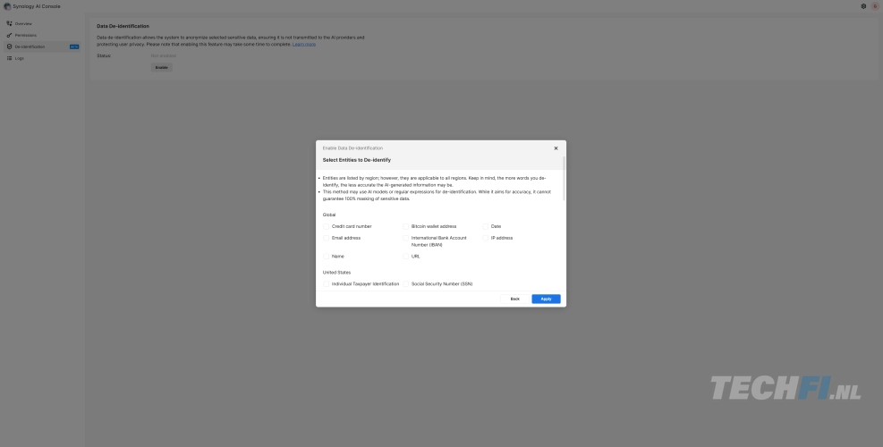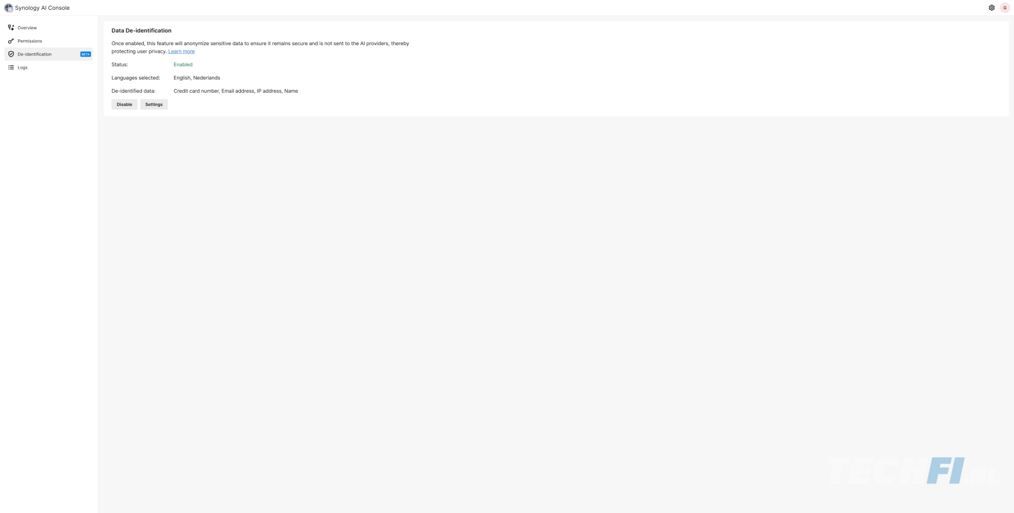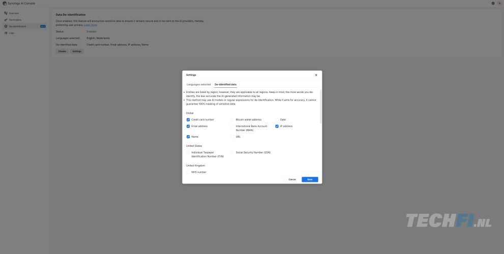 Voor dat laatste heeft Synology wel iets bedacht, en wel: een lokaal draaiend taalmodel. Om gevoelige data te beschermen biedt Synology in de AI-tool een veranonimiseringssysteem (de-identification), waarmee je kunt voorkomen dat gevoelige gegevens direct herleidbaar zijn. Bijvoorbeeld e-mailadressen, maar ook persoonsnamen of financiële data.