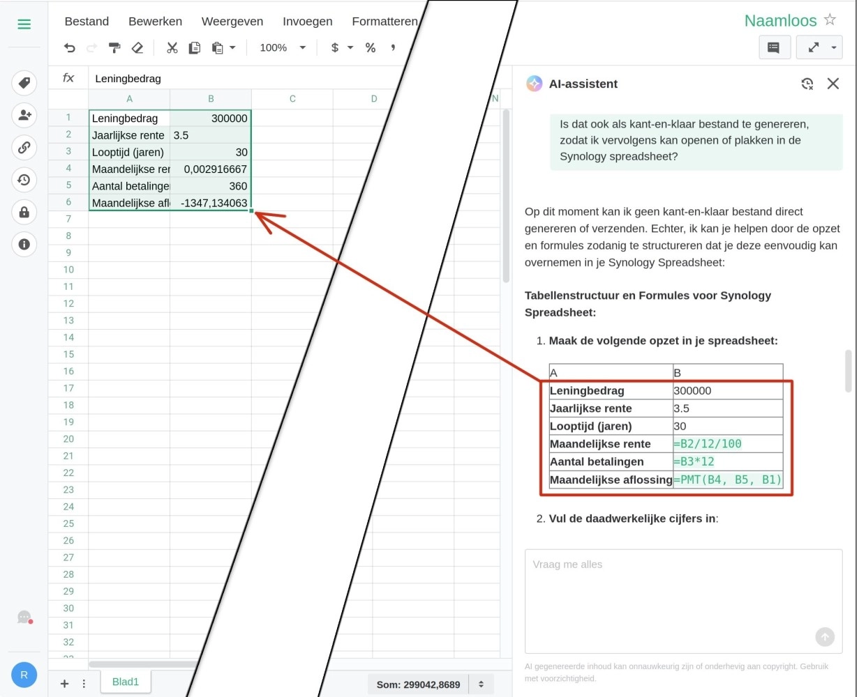 Gaan we naar de spreadsheet, weer te openen via de tab van Synology Drive. Ook daar blijkt de AI-assistent verrassend nuttig werk te kunnen verrichten. We stelden als voorbeeldvraag: ‘Kun je een spreadsheet maken waarop je de hypotheekaflossing van een huis kunt berekenen met alle benodigde variabele velden als invoer beschikbaar?´. Beetje saai, maar je weet zelf vast wel wat beters te verzinnen. We krijgen eerst een vrij uitgebreide uitleg te zien van wat nodig is, wat de formules zijn en hoe ze werken.