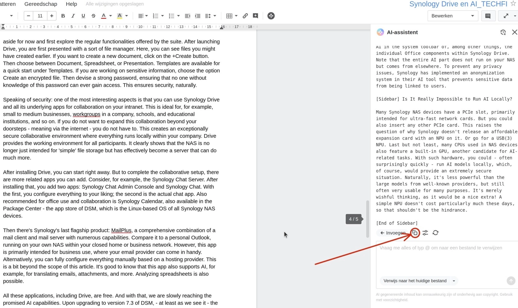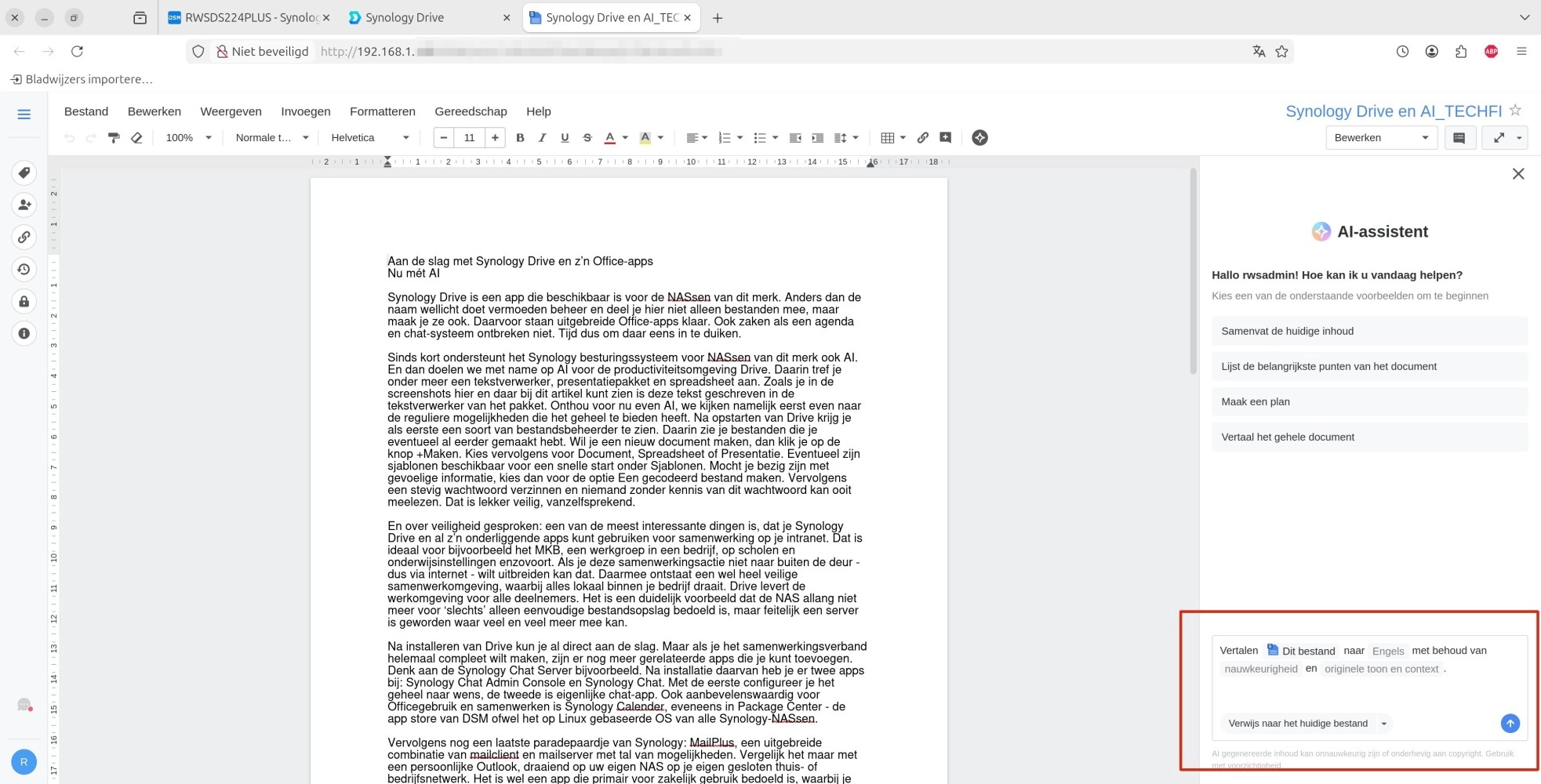 Heb je de API-hobbel eenmaal genomen, dan vind je AI terug in de systeemwerkbalk van onder meer de afzonderlijke Office-onderdelen in Synology Drive. Het is goed om te onderstrepen dat deze via een API-code ontsloten AI niet op je NAS draait, maar van elders komt. Een verbinding met internet is dus nodig, maar ook bewustzijn dat je data 'op visite' gaat.