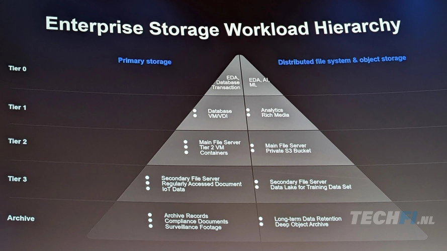 Voor deze dag ging de presentatie in op tiering, oftewel verschillende opslagvormen voor verschillende soorten data. Van 'hot' - moet onmiddellijk beschikbaar zijn - naar 'cold' (het archief). Die indeling past het enerzijds toe op primaire opslag, anderzijds op opslag in de vorm van gedistribueerde bestandssystemen en object storage. Voor de meest veeleisende opslag kondigde Synology (weer) de PAS7700 aan, een nvme-gebaseerde opslagserver op basis van Synology U.3 nvme ssd's en nvme-over-fiber. Daarmee is dit een zeer snel opslagsysteem, dat 'end-to-end nvme' biedt. Met meerdere zeer snelle netwerkinterfaces (4x 100 GbE of 12x 25 GbE) moet het systeem cruciale data zeer snel beschikbaar stellen.