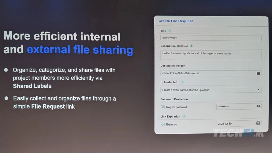 Nieuw aangekondigd op deze Solution Day zijn File Requests en File Labels. Met het eerste kunnen gebruikers specifieke bestanden opvragen, het tweede maakt het mogelijk groepen bestanden te bundelen onder een bepaald label. Zoals kenmerkend voor Synology toepassingen is het mogelijk heel fijnmazig toegang tot bestanden te geven, inclusief beperkingen qua beschikbaarheid in tijd. Een andere nieuwigheid is de mogelijkheid bestanden te vergrendelen, zodat slechts één persoon eraan kan werken. Standaard is juist de mogelijkheid met meerdere mensen aan documenten te werken een voordeel van Synology Office.